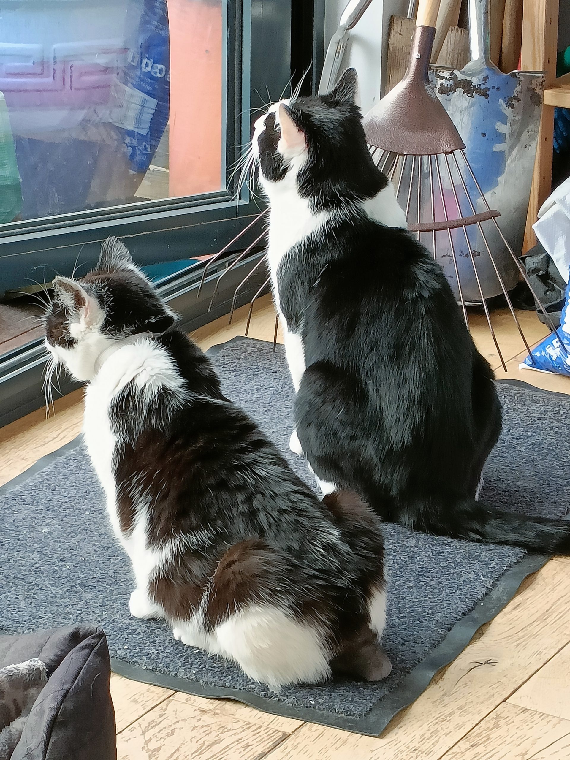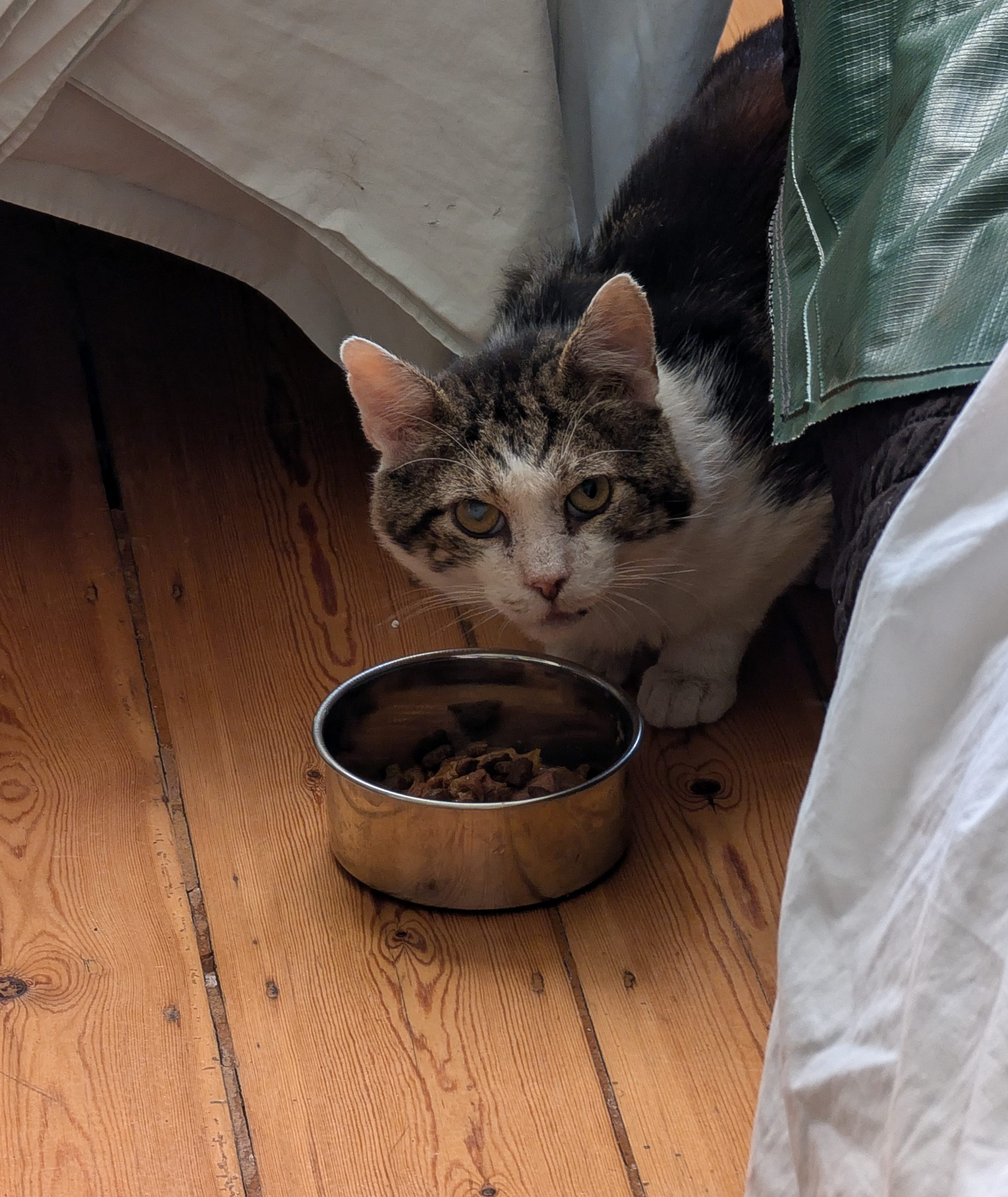 A very unhappy and scared tom cat, not used to being indoors. Hiding on top of the cupboard.